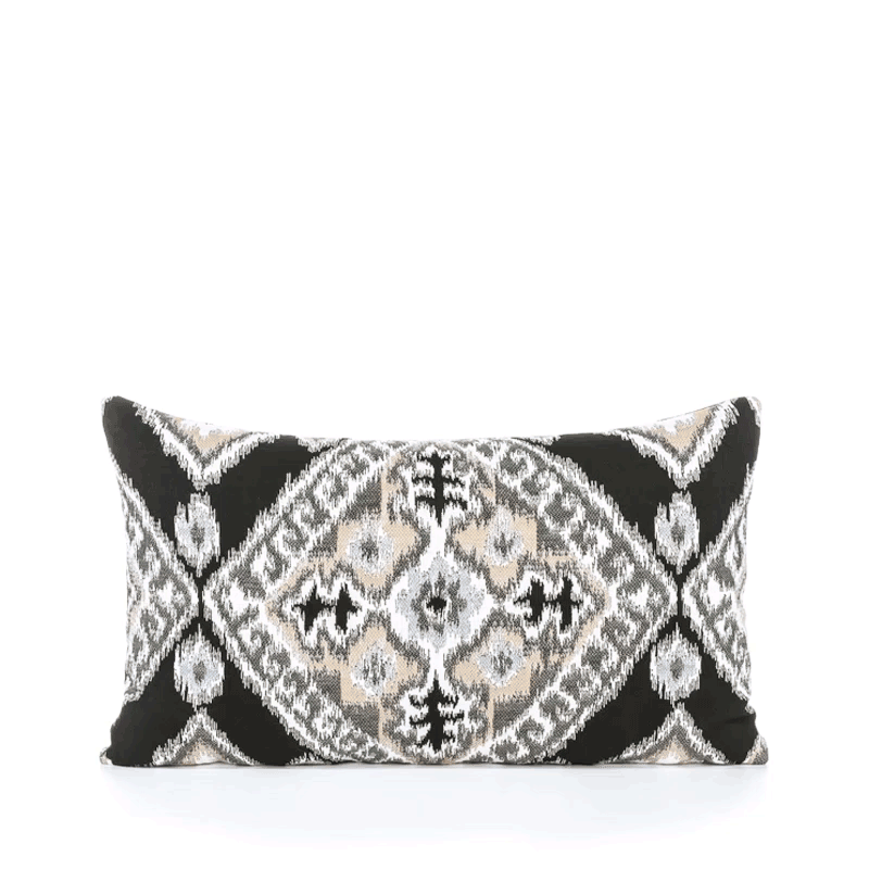 Traditional ikat motifs are reinvented with bold and dramatic strokes, creating an intricate pattern with a modern aesthetic. The Ikat Diamond pillow is a captivating focal point with strong appeal.